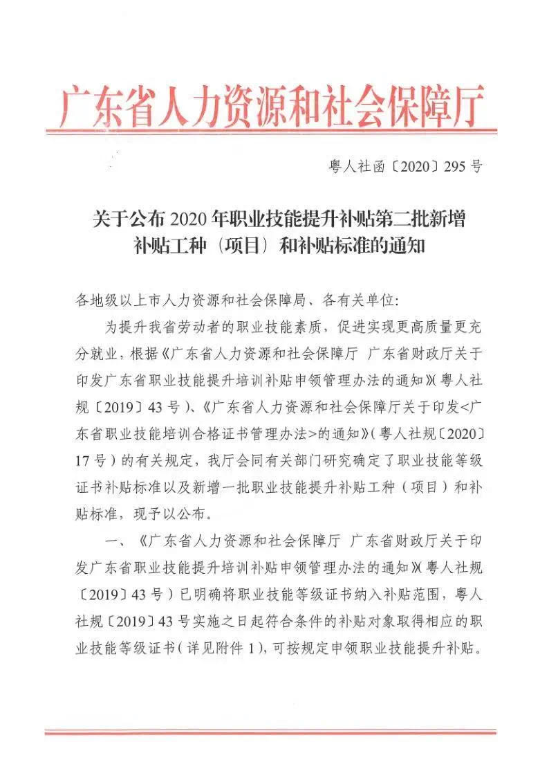 2. 截选《关于公布2020年职业技能提升补贴第二批新增补贴工种(项目)和补贴标准的通知》粤人社函[2020]295号文