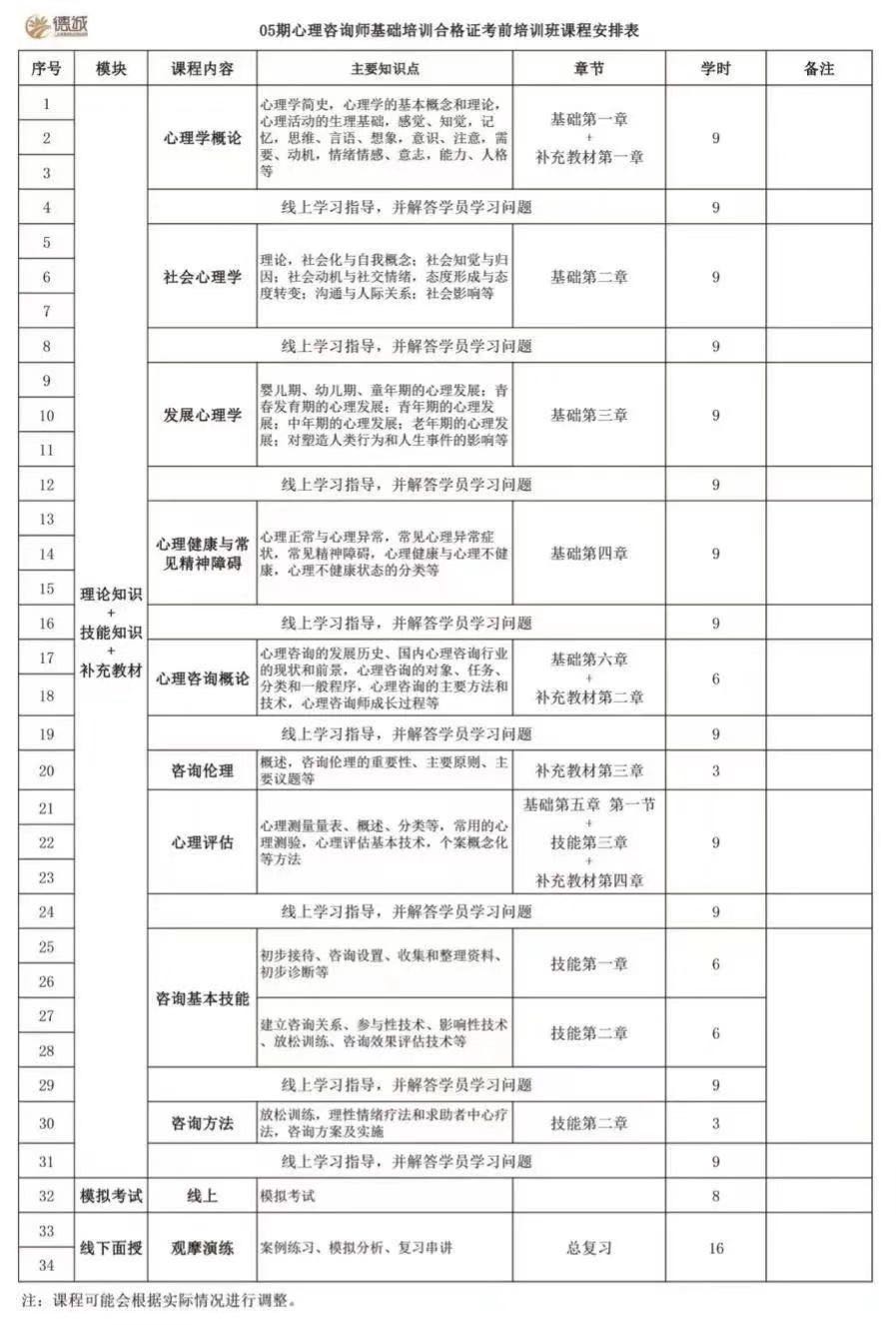 心理学概论、人格与社会心理学、发展心理学、心理健康与常见精神障碍,心理咨询概论、咨询伦理、心理评估、咨询基本技能、咨询方法、观摩演练、考前辅导等。