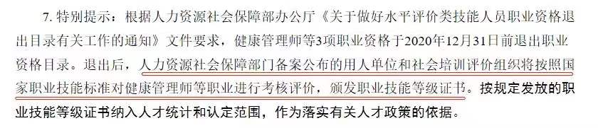 Q:听说2021年健康管理师考试政策有变化?这个职业被取消了吗? 根据政府“放管服”和对技能人员评价制度进行深度改革的要求,2020年人社部发布《关于做好水平评价类技能人员职业资格退出目录有关工作的通知》,公布将于2020年12月31日前将水平评价类技能人员职业资格分批有序退出目录。然而,人社部同时一再强调,推动水平评价类技能人员职业资格退出国家职业资格目录,不是取消相应职业和职业标准,更不是取消技能人才评价。只是由资格评价改为技能等级认定,改变了评价发证主体和管理服务方式,实行“谁用人、谁评价、谁发证、谁负责”,真正发挥用人主体作用和社会组织作用,为技能人才成长成才提供更加广阔的天地。