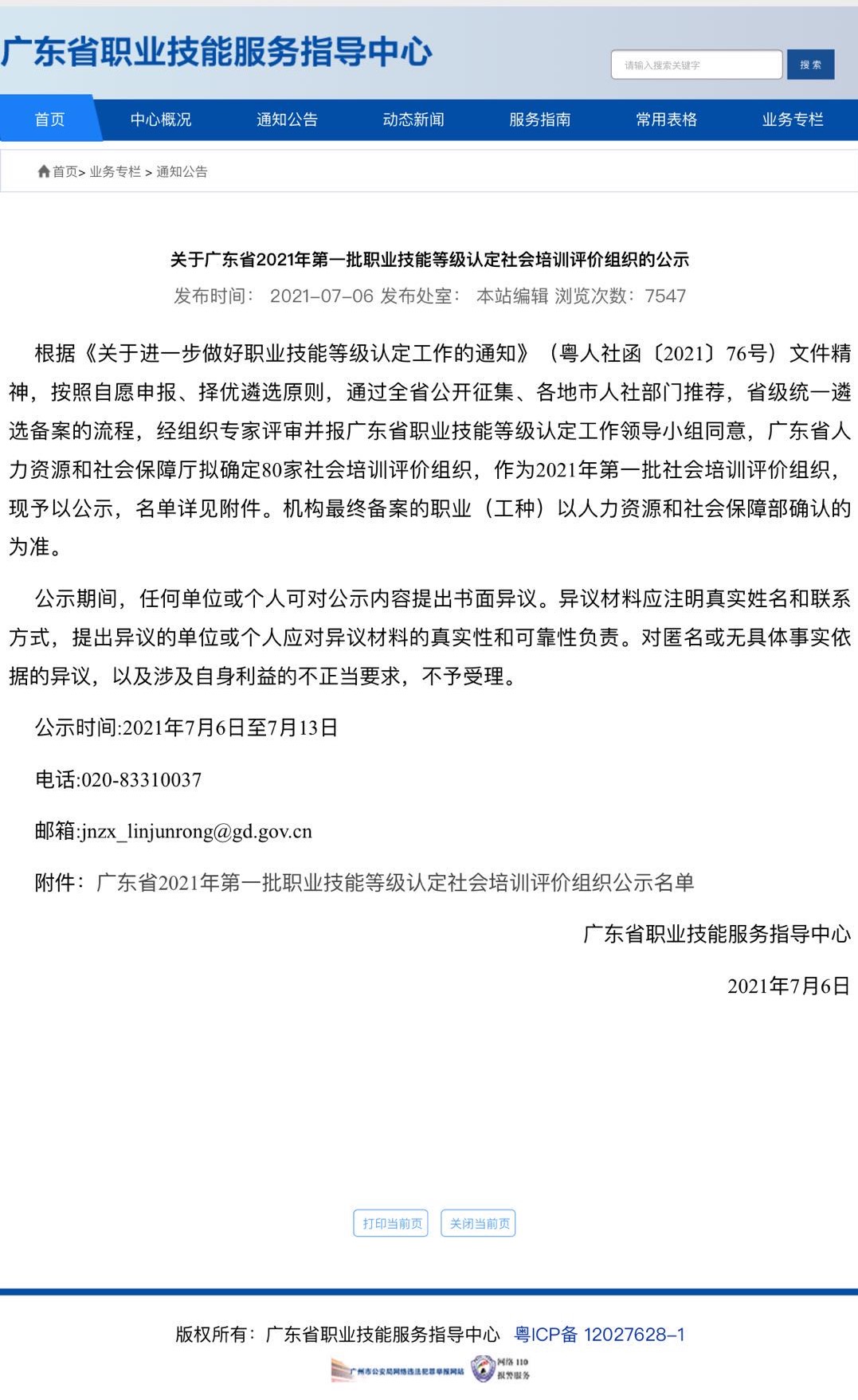 根据《关于进一步做好职业技能等级认定工作的通知》(粤人社函〔2021〕76号)文件精神,按照自愿申报、择优遴选原则,通过全省公开征集、各地市人社部门推荐,省级统一遴选备案的流程,经组织专家评审并报广东省职业技能等级认定工作领导小组同意,广东省人力资源和社会保障厅拟确定80家社会培训评价组织,金年会6766学院很荣幸能成为首批2021年首批社会培训评价组织机构之一。