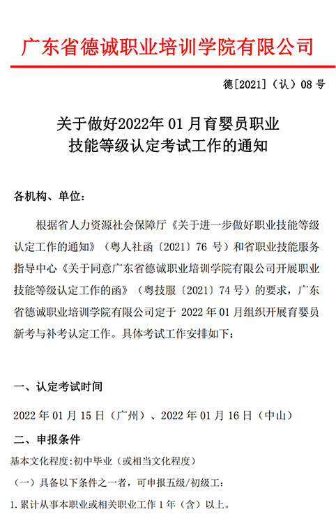 关于做好 2022 年01月育婴员职业技能等级认定考试工作的通知