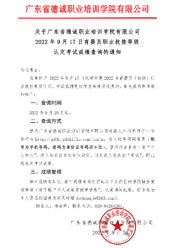 关于金年会67662022 年9月17日育婴员职业技能等级认定考试成绩查询的通知